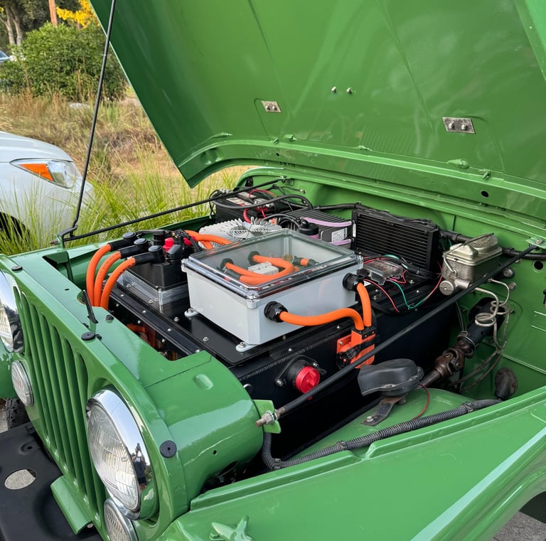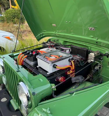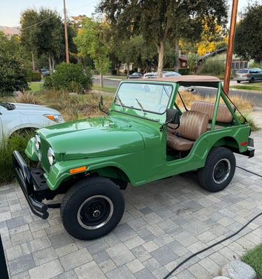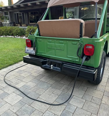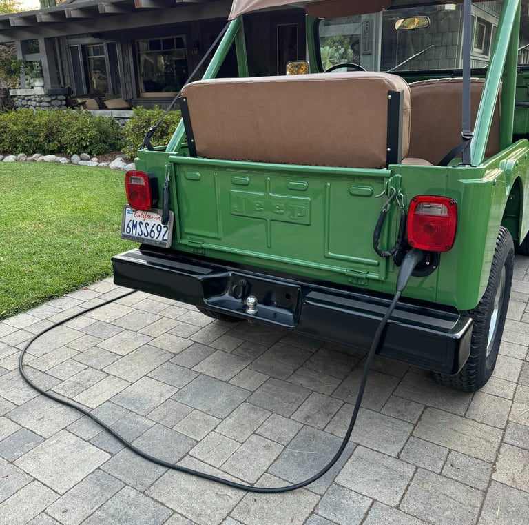 Our Jeep is a 1977 CJ5 that was converted to be fully electric in 2024. It has a 95 Kw (127 Hp) Net Gain Hyper9 motor. It uses five Tesla Model S batteries with 26.5 kWh of capacity and gets about 60 miles per charge.